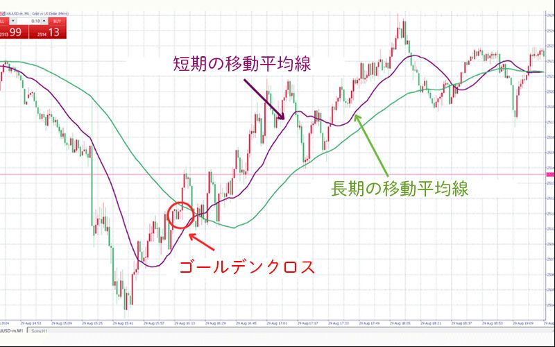 ゴールデンクロスは、短期移動平均が長期移動平均を上回ると発生します。