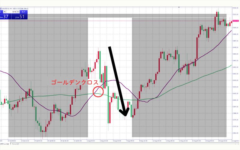上のグラフでは、ゴールデンクロスが発生していますが、その後価格が下落しています。