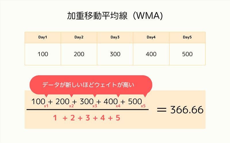 WMA =(5日前の終値 × 1 + 4日前の終値 × 2 + 3日前の終値 × 3 + 2日前の終値 × 4 + 1日前の終値 × 5)÷ 15