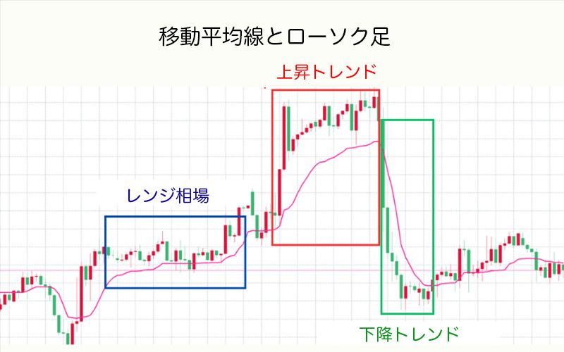 また、移動平均線とローソク足の位置関係によってもトレンドを判断できます。