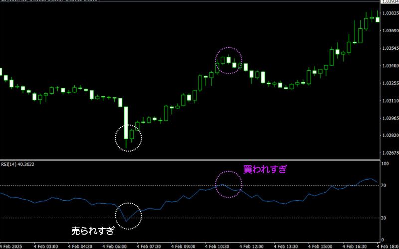 RSIの最も一般的な使い方は、数値に基づいて市場の「買われすぎ」や「売られすぎ」の状態を判断し、売買シグナルとして活用する方法です。
