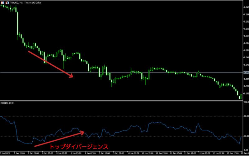 相場が新高値を付けているのに、RSIが新高値を更新しない場合、「トップダイバージェンス」となり、下降トレンドへの転換を示唆します。