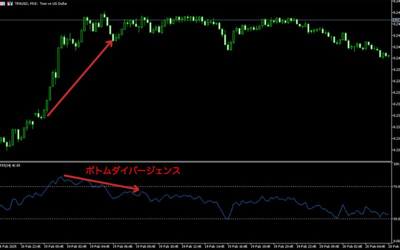 相場が新安値を付けているのに、RSIが新安値を更新しない場合、「ボトムダイバージェンス」となり、上昇トレンドへの転換を示唆します。