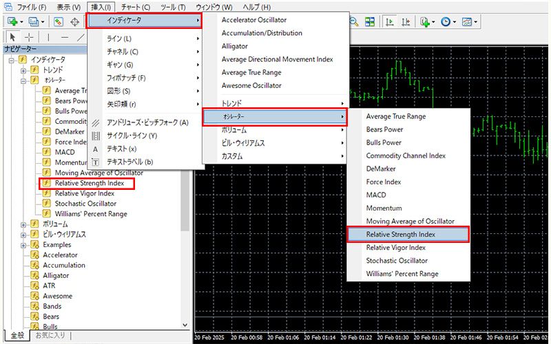 ③ メニューバーの「挿入」→「インディケータ」→「オシレーター」→「Relative Strength Index(相対力指数)」を選択