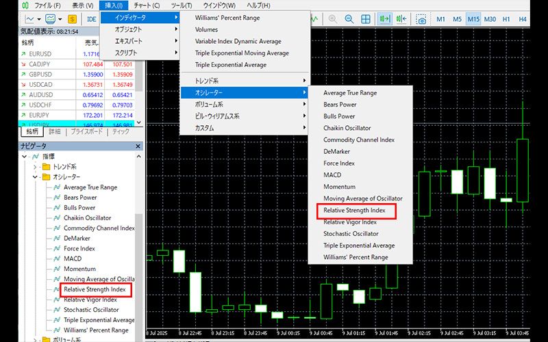 または「ナビゲーター」→「インディケータ」→「オシレーター」→「Relative Strength Index」を選択
