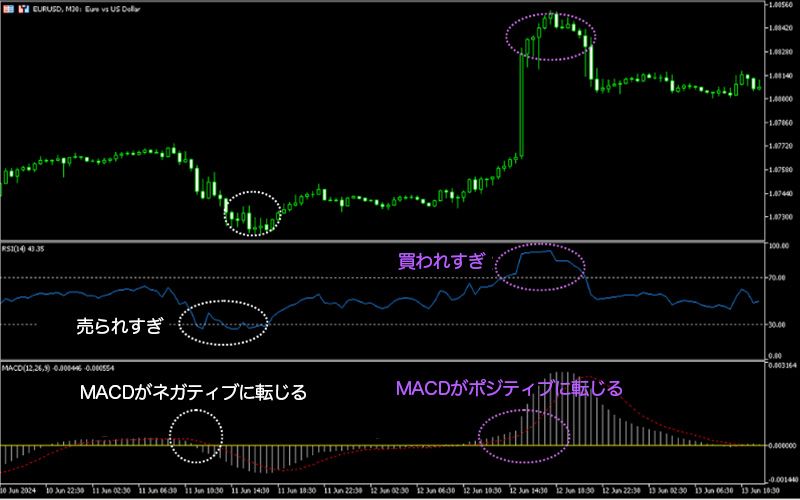 RSIは他のテクニカル指標と組み合わせることで、トレードの精度と信頼性を高めることができます。以下は代表的な2つの組み合わせです。