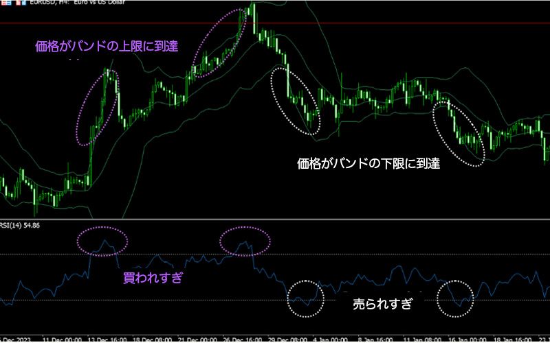 価格がボリンジャーバンドの上限に近づき、RSIが買われすぎゾーンにある場合、市場は過熱状態にあり、価格が反落するリスクがあります。逆に、価格がバンドの下限に接近し、RSIが売られすぎゾーンにある場合、反発や反転の可能性があります。