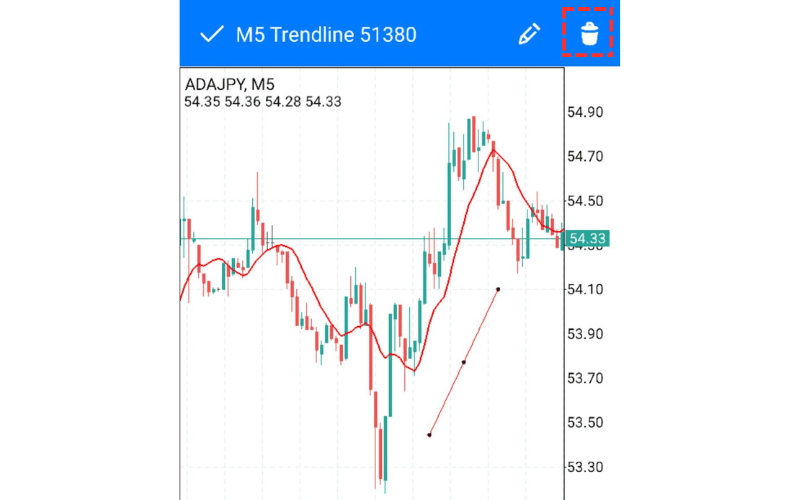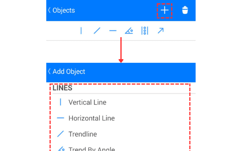 To draw objects like lines, tap the objects icon at the top, or tap the chart and select the objects icon from the menu that appears.