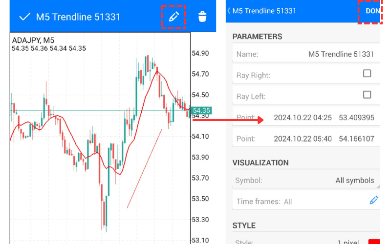 Tap and hold the object to display the object's menu at the top. Tap the left pen icon to go to the settings screen, where you can specify extensions, display position, chart, color, and style. Tap "Done" in the upper right to save changes.