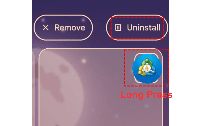 To uninstall the app, long-press the MetaTrader4 icon on the screen, then select "Uninstall" from the menu.
