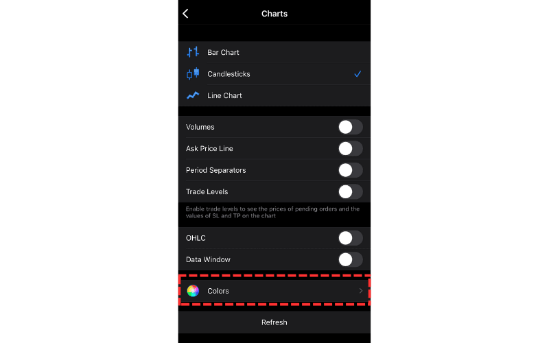 In the color settings screen, you can select from preset color schemes under 'Scheme'. You can also fine-tune the colors of various parts of the chart under the 'Colors' section.