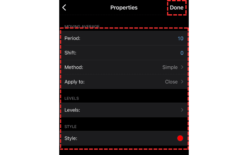 Set the parameters and tap 'Done' in the upper right corner to display the indicator.