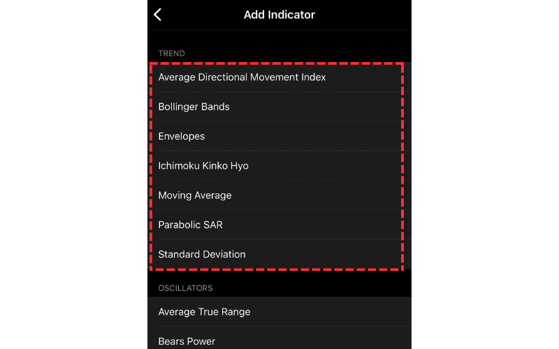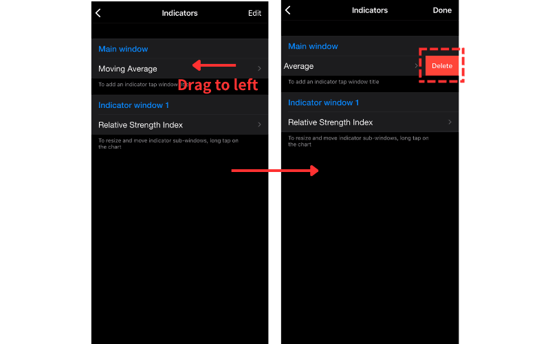 To delete unwanted indicators, either tap the indicator icon at the top of the chart or tap on the chart and select 'Indicators' from the menu that appears. Swipe left on the indicator name you wish to delete and tap the red 'Delete' button that appears.