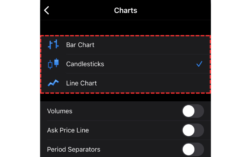 From the settings screen that appears, tap on the chart type you wish to display to change it.