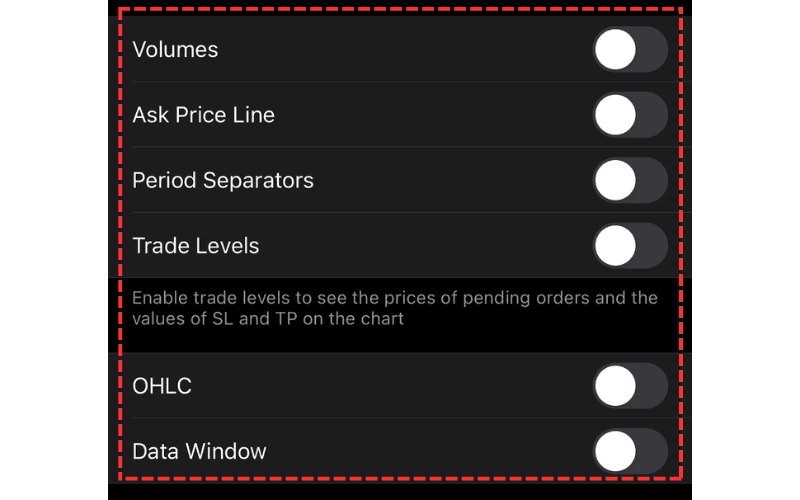 In the iOS version of MT4, you can toggle the display of volume, ask price line, period separators, trade levels, trading history, OHLC, and data window (shows values of indicators in crosshair mode).