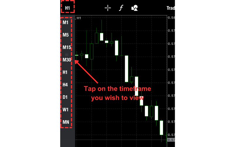 Tap the current timeframe displayed in the upper left corner of the chart screen to show a list of timeframes, then tap the timeframe you wish to display.