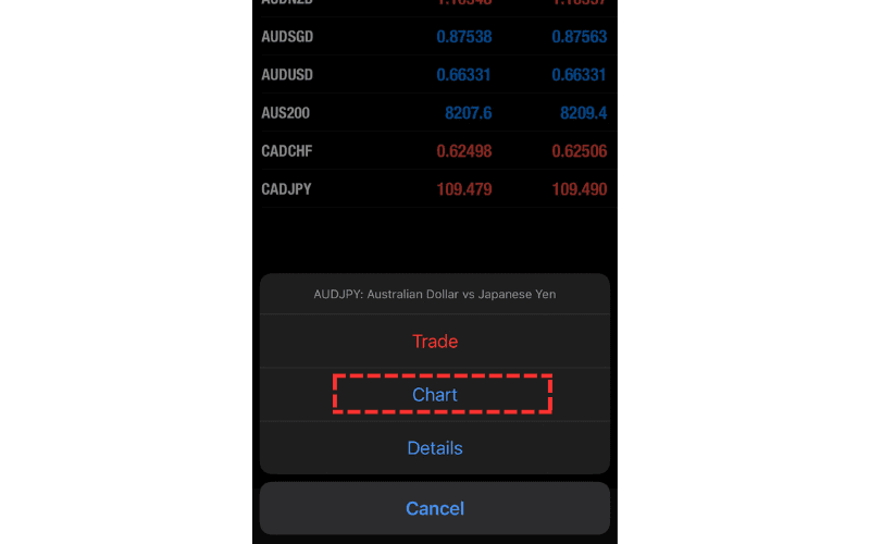 Tap the symbol you want to display the chart for and select 'Chart' to display its chart.