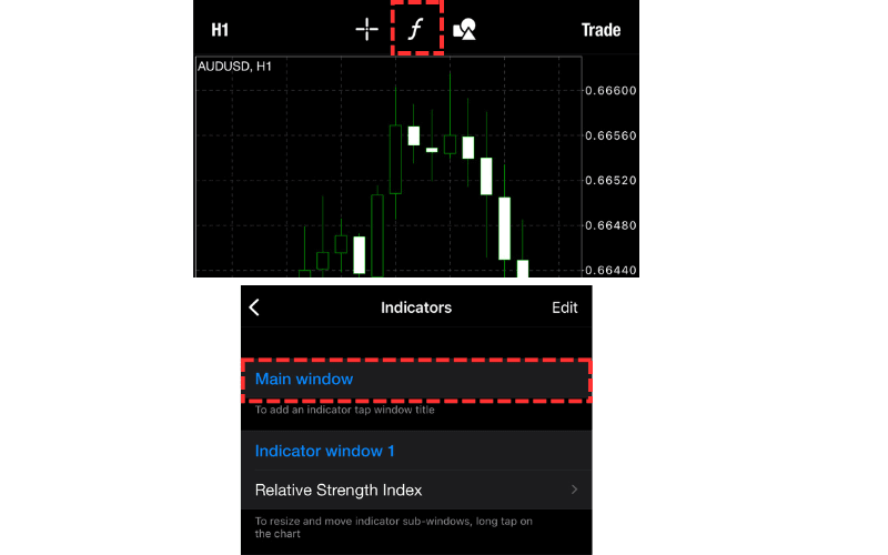To display indicators, tap the indicator icon at the top of the screen and select 'Main Window' in the 'Indicators' screen.