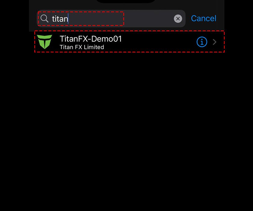 Type "titan" in the search field and tap "TitanFX-Demo01" from the results.