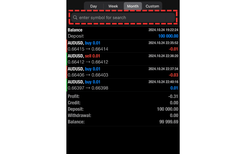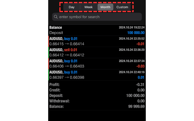 You can select the display period for the trading history from the tabs at the top of the trading history screen. Choosing 'Custom' allows you to specify any period.