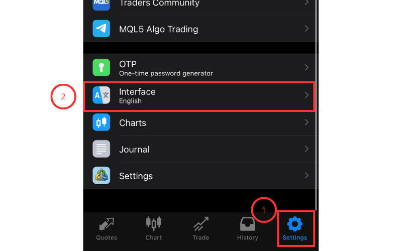 In the iOS version of MT4, you can easily switch language settings.