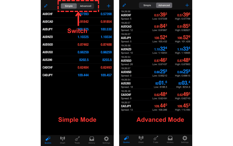 In the iOS version of MT4, you can display the Bid and Ask prices in a simple mode or choose a advanced mode that shows last updated time, spread, high, and low among others.