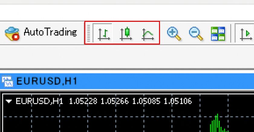 Select the icon for the desired chart type from the MT4 toolbar by clicking on it to switch the type of chart.