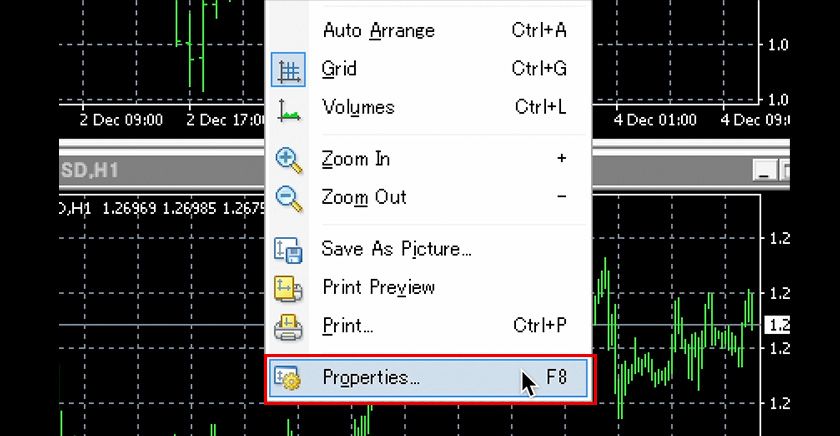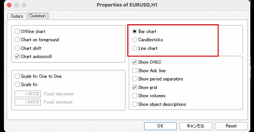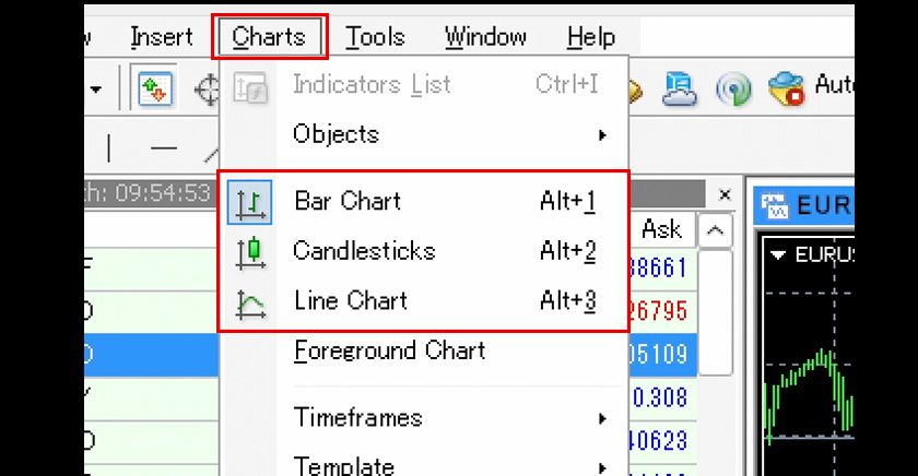 In MT4 charts, you can display three types of charts: candlestick, bar chart, and line chart.