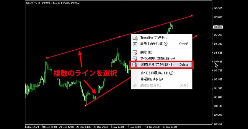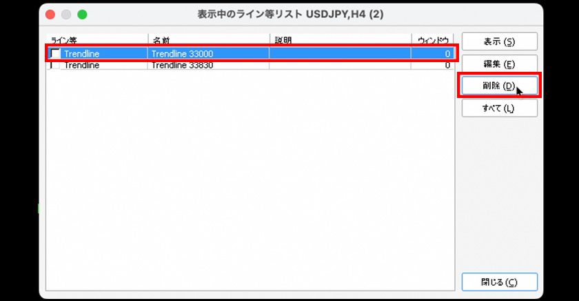 Select the line you want to delete from the displayed list, then click the "Delete" button on the right to remove the trendline.