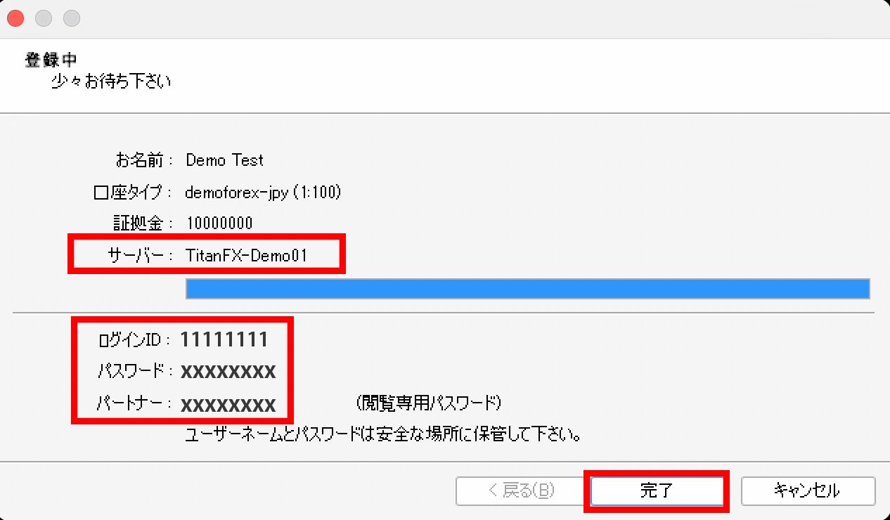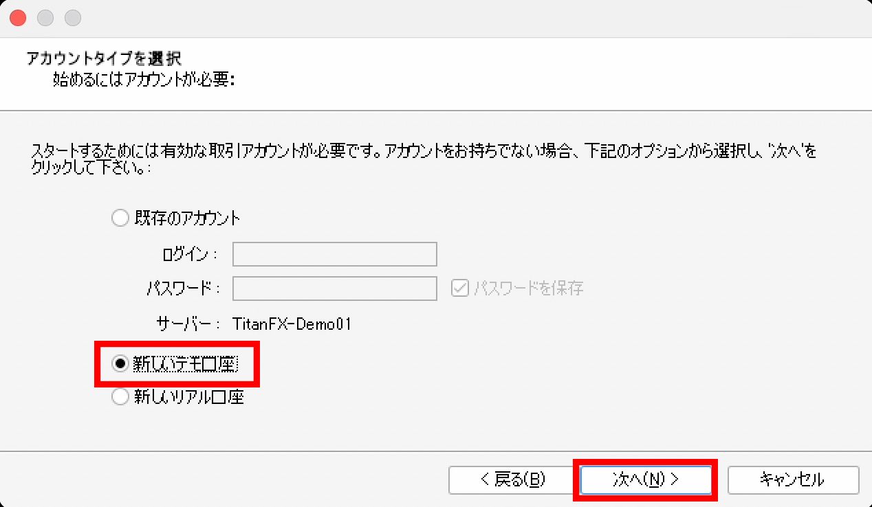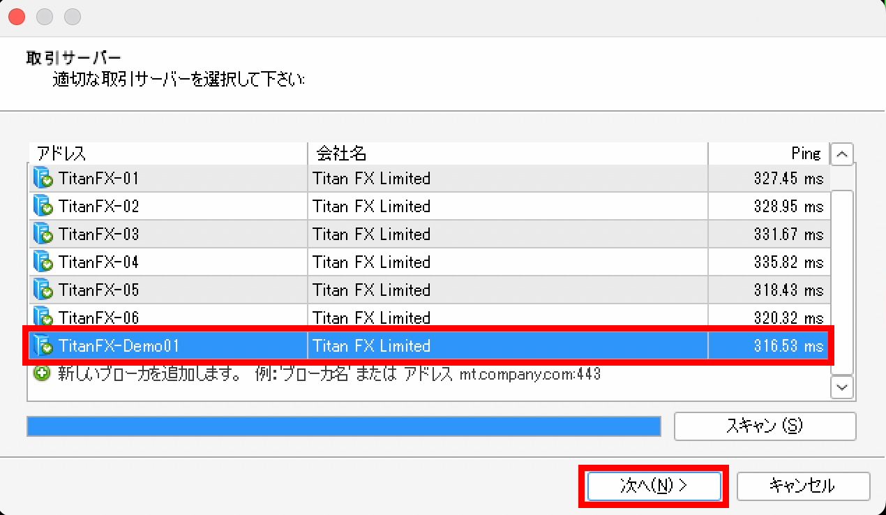 Select "TitanFX-Demo01" from the trading server in the dialog that appears, then click "Next".