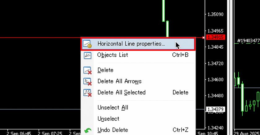 Right-click on the selected horizontal line and choose "Horizontal Line Properties" from the menu to open the properties window.