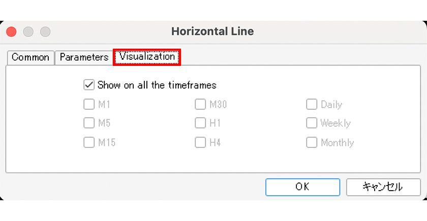 The "Visualization" tab allows you to specify the timeframes in which the horizontal line is displayed. Uncheck "Show on all timeframes" to display the line only on selected timeframes.
