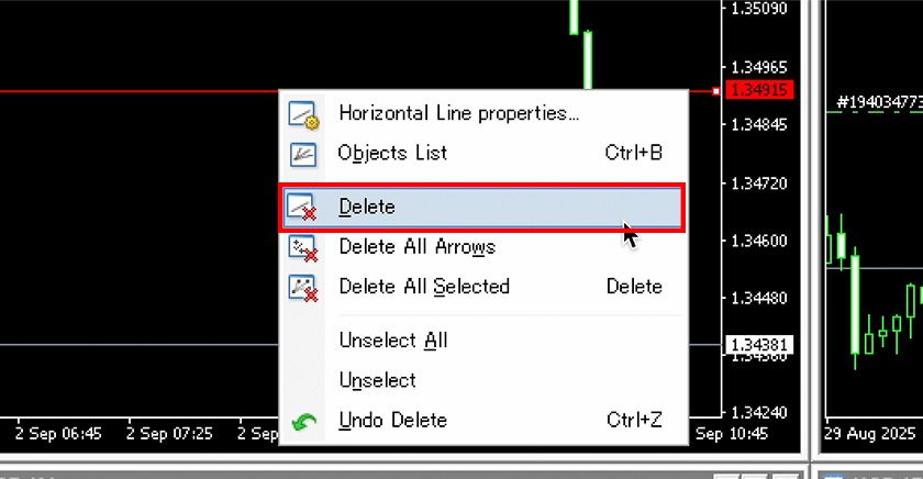 To delete a horizontal line, right-click on the selected line and choose "Delete" from the displayed menu.