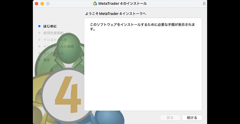 Double-click the downloaded Zip file and double-click the extracted MetaTrader4.pkg to start the installer.