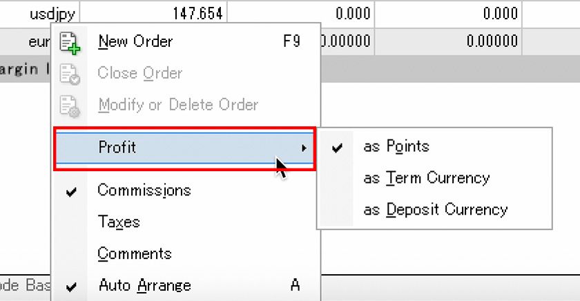 The profit and loss display in the "Trade" tab of the MT4 terminal can be switched between "Display in Points (minimum tick size as 1)," "Display in Instrument Settlement Currency," and "Display in Margin Currency (account currency)."
