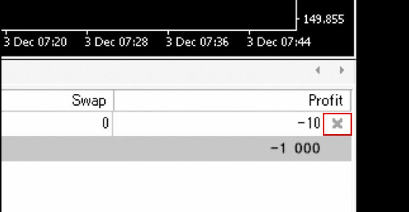 In MT4, you can execute a market close at any time during trading hours. The method for market closing varies slightly depending on whether one-click trading is enabled.