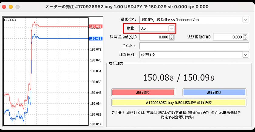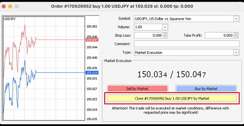 Click the yellow market close button in the displayed order placement window to complete the closure.