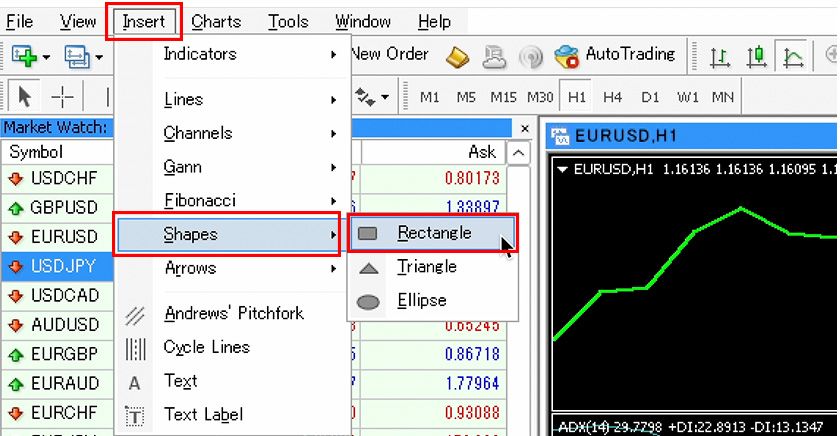 The cursor will switch to rectangle drawing mode. Click and drag on the chart to draw a rectangle at your desired position.