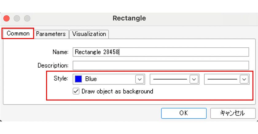 In the rectangle's properties window, you can specify the line color and style in the "Common" tab under "Style." To fill the rectangle, check the "Draw as Background" option.