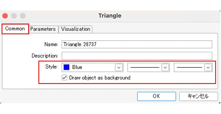 In the triangle's properties window, you can specify the line color and style in the "Common" tab under "Style." To fill the triangle, check the "Draw as Background" option.