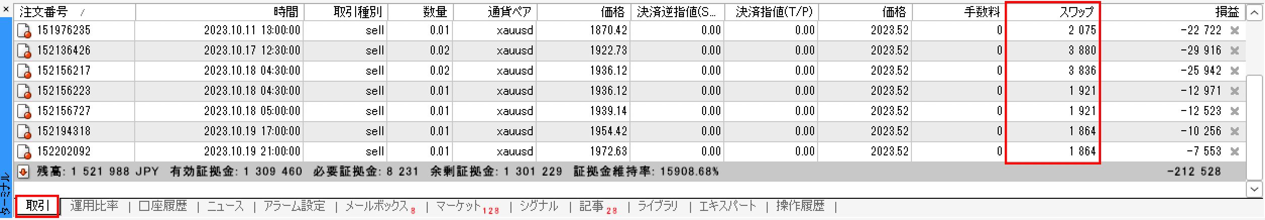 The swap points for open positions are displayed in the "Swap" column within the "Trade" tab of the terminal.