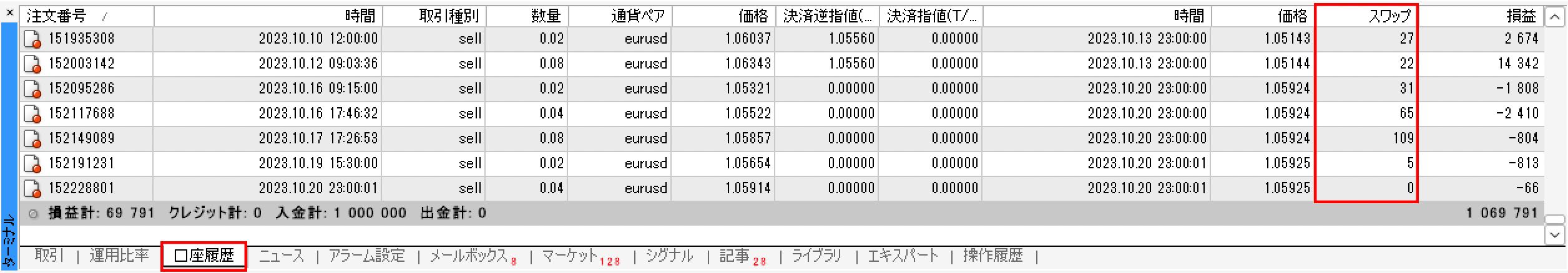 The swap points for closed positions are displayed in the "Swap" column within the "Account History" tab of the terminal.