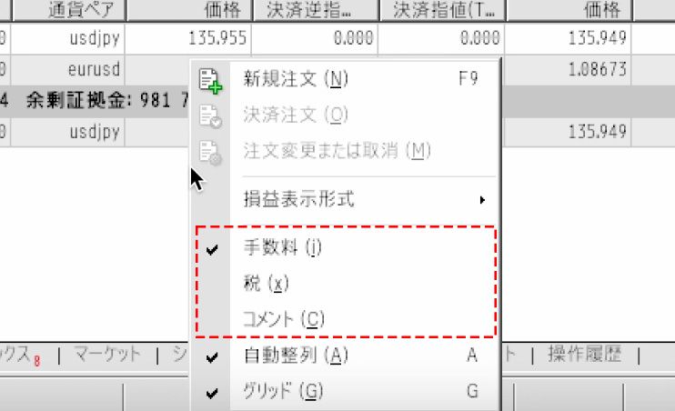 To change the settings, right-click in the 'Trade' tab, and from the menu that appears, choose the desired details from options ranging from 'Commission' to 'Comments' and check them.