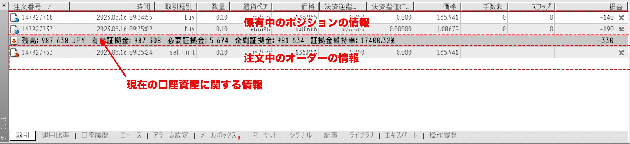 In the 'Trade' tab of the MT4 terminal, you can view information about your current holdings, details of pending limit and stop orders, and information about your account's current assets.