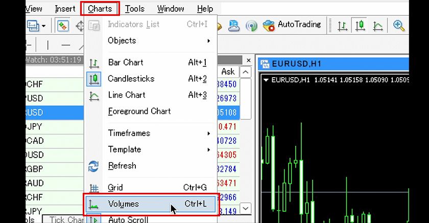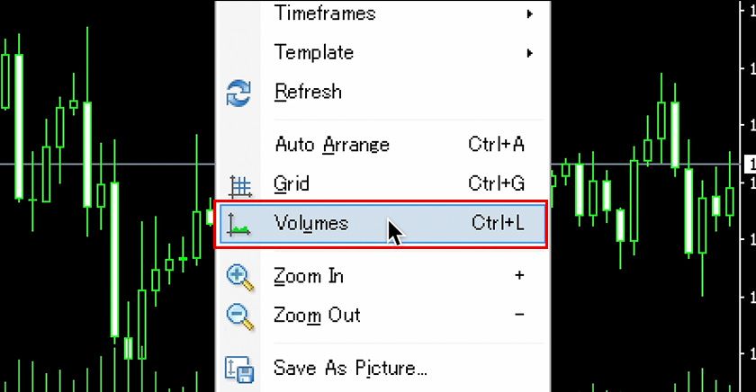 We guide you on how to toggle the display of tick volume on and off in MT4 charts.