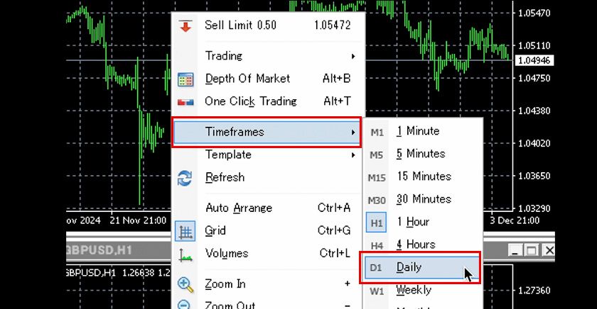 Right-click on the chart, and from the menu that appears, select 'Time Frame Settings' to choose and switch to the desired time frame.