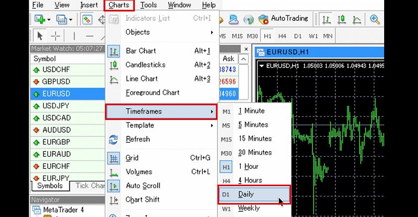 You can switch the time frame by selecting the desired time frame from 'Time Frame Settings' under the 'Chart' menu in MT4.