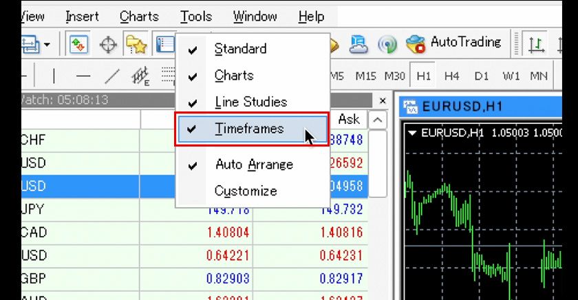 If the time frame is not displayed on the toolbar, right-click on the toolbar and select 'Time Frame Settings' to display it.