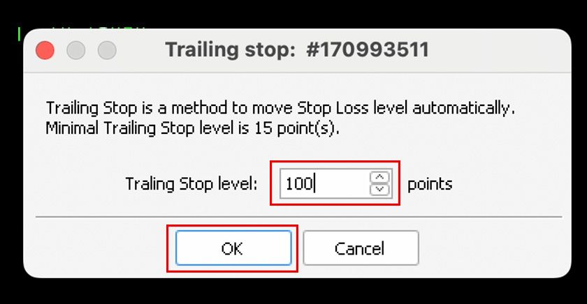 *A trailing stop only activates if the price moves favorably by the specified number of points. If the price never reaches that level, no stop-loss order will be set. It is recommended to set a separate stop-loss order as a precaution.