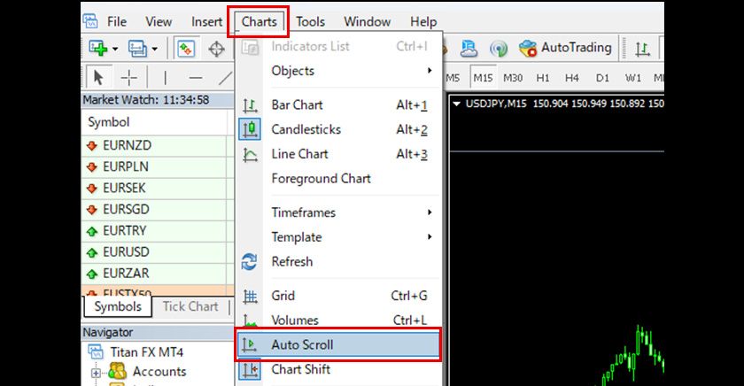Clicking 'Auto Scroll' in the 'Charts' menu of MT4 allows you to toggle the chart's auto-scroll feature on and off.